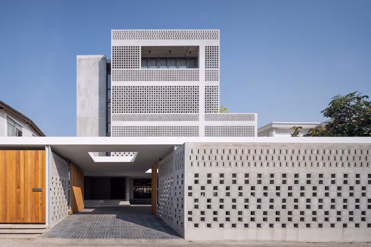Một trong những chi tiết đắt giá nhất của công trình chính là hệ mặt đứng sử dụng gạch rỗng. Thay vì xây tường đặc, kiến trúc sư đã sử dụng gạch rỗng với mật độ lỗ thoáng thay đổi theo chiều cao tầng nhà để tối ưu hóa sự riêng tư và ánh sáng.
