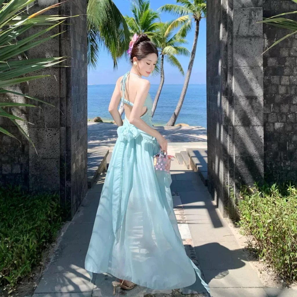 Thiết kế đầm maxi truyền thống thường có đường may dài, che phủ toàn bộ chân, tạo cảm giác thướt tha và duyên dáng. Đối với phiên bản xanh mint, nhà thiết kế đã bổ sung các chi tiết như hai dây nhún ngực tinh tế, tạo điểm nhấn nhẹ nhàng nhưng không quá phô trương. Hai dây này còn giúp giảm áp lực lên vai, tăng cường sự thoải mái khi di chuyển, nhất là trong các hoạt động như dạo chơi, tắm nắng hay chơi thể thao nhẹ trên cát.