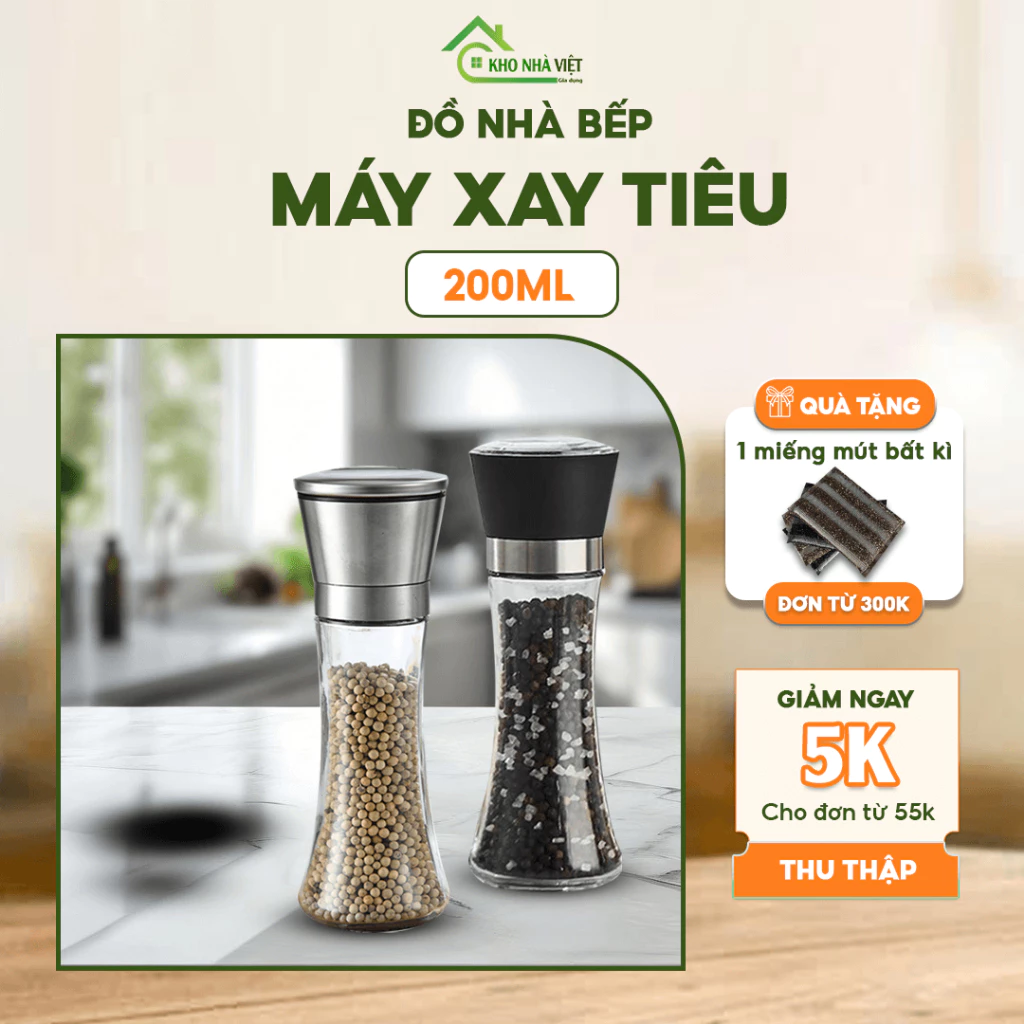 Lọ Xay Tiêu Thủy Tinh Cao Cấp Bằng Tay – Dụng Cụ Xay Tiêu, Muối, Gia Vị Lõi Gốm Siêu Bền, An Toàn Thực Phẩm