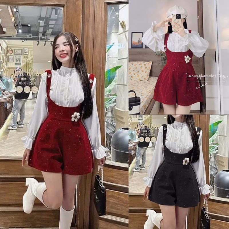 🔥 Bigsize Set yếm nhung kim tuyến + áo sơ mi tay dài trắng 55-95kg đang giảm giá!